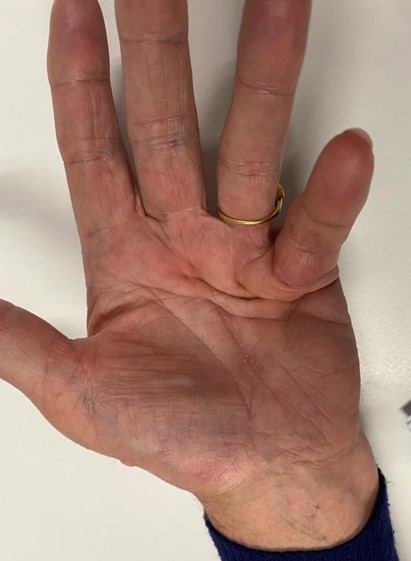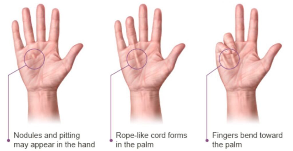 A Doença de Dupuytren é uma condição que afeta a palma da mão e os dedos, levando ao desenvolvimento de nódulos e cordões fibrosos que causam uma retração progressiva dos dedos. Com o tempo, esses tecidos fibrosos podem puxar um ou mais dedos em direção à palma, dificultando a extensão e limitando a funcionalidade da mão. A doença afeta mais frequentemente o dedo anelar e o dedo mínimo e é mais comum em homens, especialmente de origem nórdica ou com histórico familiar.
