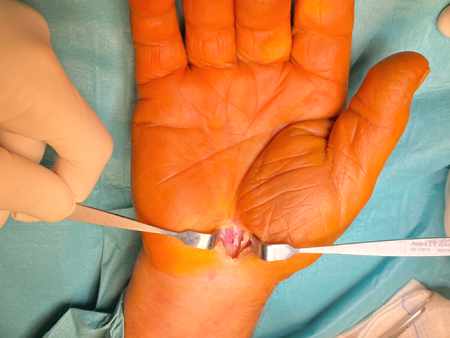 O tratamento consiste na abertura do ligamento transverso do carpo.